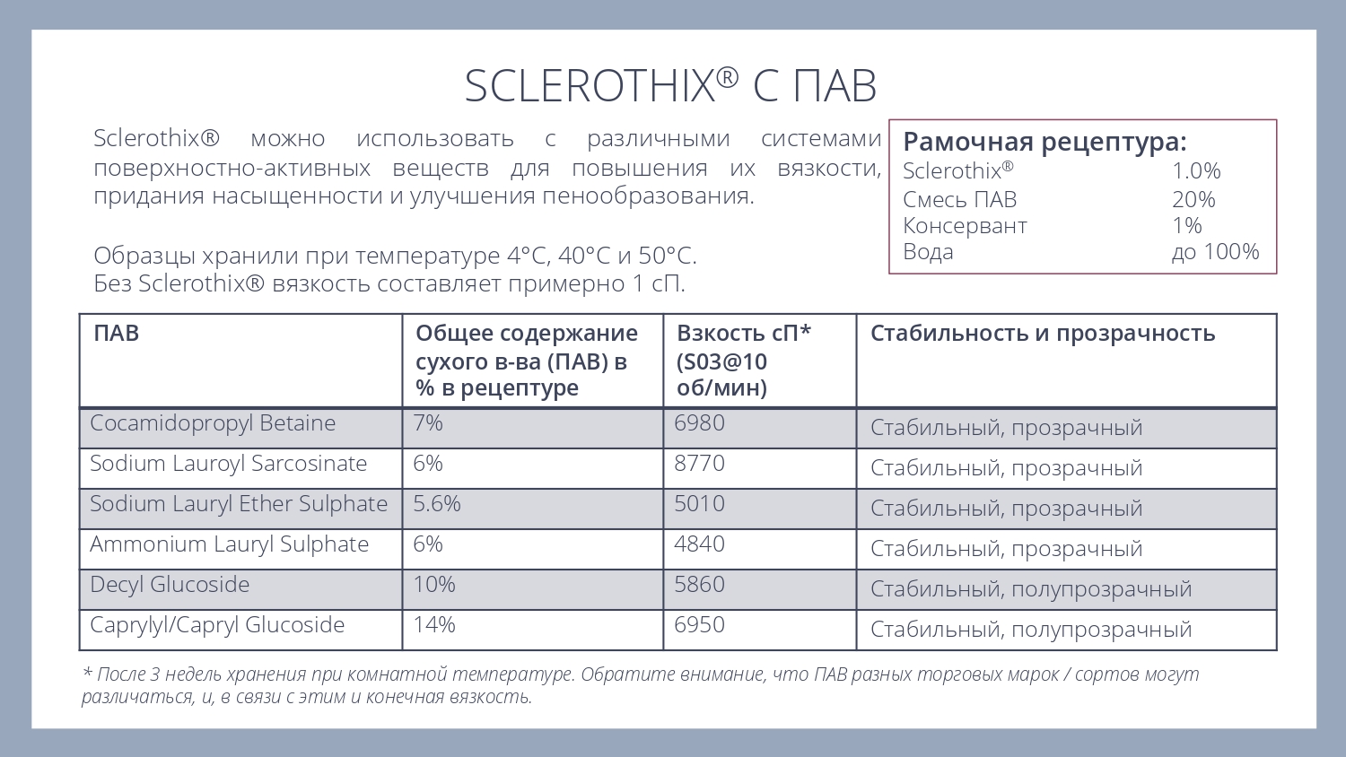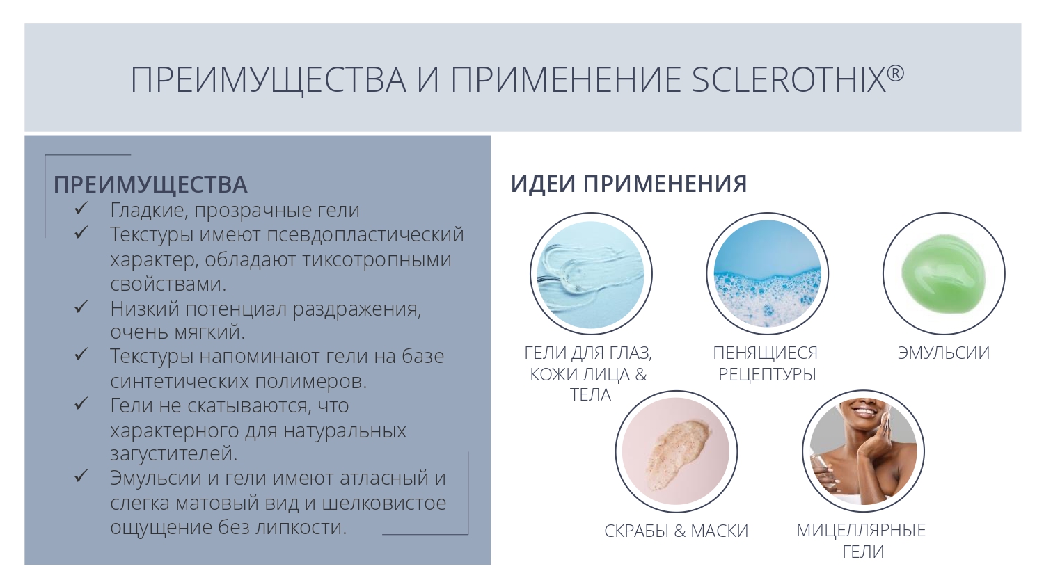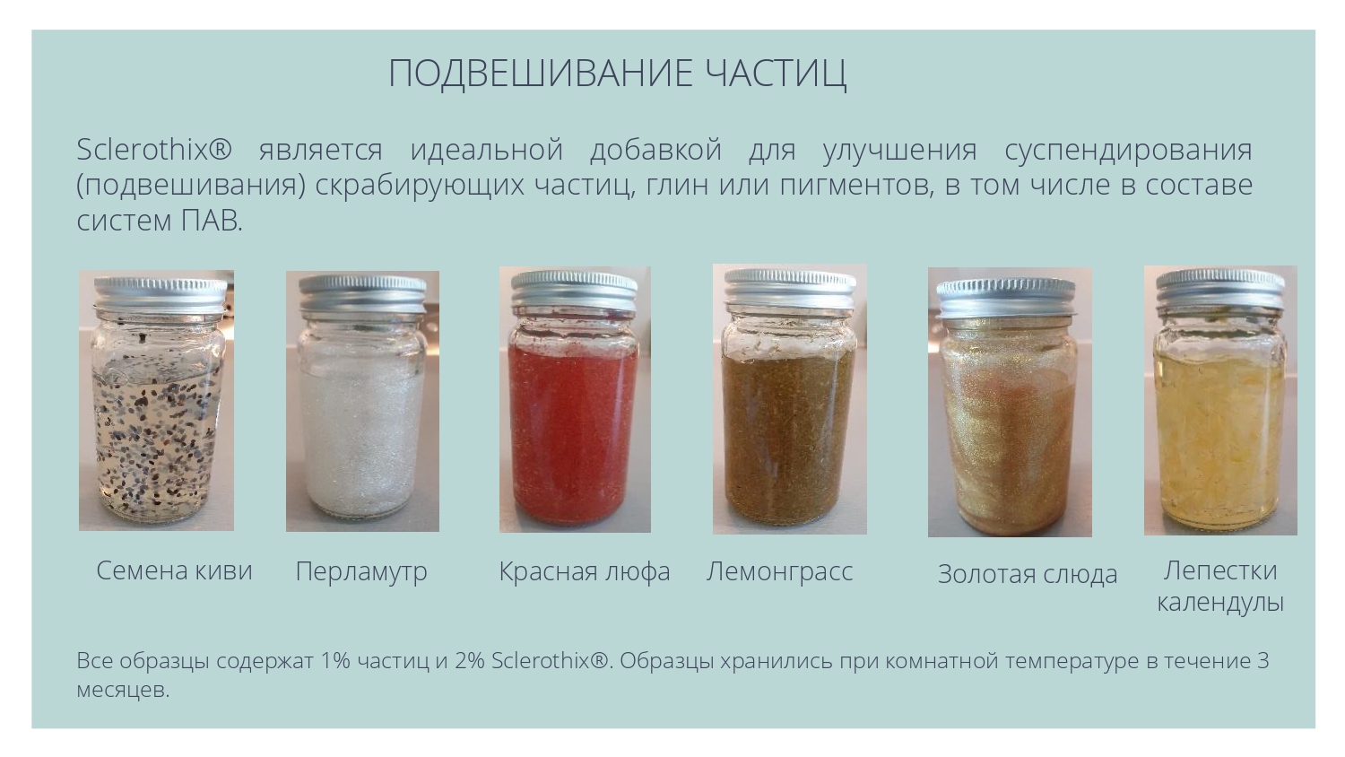 Sclerothix® является эффективной добавкой для улучшения суспендирования (подвешивания) различных частиц - скрабов, глин или пигментов, в том числе в составе моющих систем.